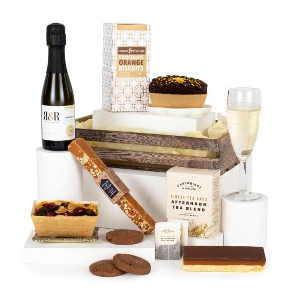 A selection of English Breakfast tea, cherry and almond cake and a bottle of prosecco.This hamper is sure to put a smile on the face of your loved one. This hamper contains 7 items: Prosecco R&R Robert & Reeves Italy 20cl 10.5% vol Cartwright & Butler English Afternoon Blend – 10 Finest Tea Bags 30g Crunch & Crumble Chocolate Orange Biscuits 150g Crunch & Crumble Millionaire Shortbread Slice 80g House of Fudge Nut Sundae Fudge Log 100g Maxwell & Franks Mini Cherry & Almond Cake 125g Maxwell & Franks Decorated Mini Chocolate Loaf Cake 120g Delivered in a grey wash wooden crate.