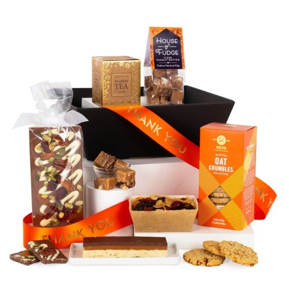 A gift hamper filled with tasty treats is the perfect way to say “Thank You” to someone special. Presented in a black tray with ‘Thank You’ ribbon, this gift includes a wonderful selection of sweet treats to enjoy with a nice cup of tea! This hamper contains 6 items: Crunch & Crumble Millionaire Shortbread Slice 80g House of Fudge Tiger Peanut Butter Fudge 100g Maxwell & Franks Mini Cherry & Almond Cake 125g New English Teas English Breakfast Tea 10 Teabags 20g Reids Salted Caramel Oat Crumbles 150g Stas Decorated Milk Chocolate Bar 100g Delivered in a Black Tray with Thank You Ribbon.